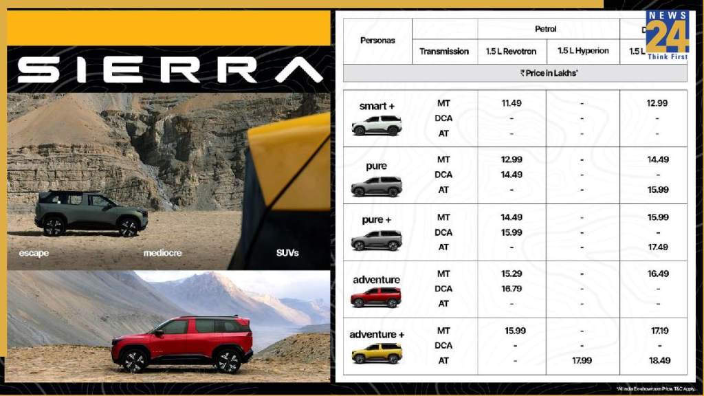 The 2025 Tata Sierra Price starts at Rs 11.49 lakh( introductory) and extends to Rs 18.49 lakh for the Adventure + diesel automatic variant. The sierra will be available in 7 trims these will include Smart+, Pure, Pure +, Adventure, Adventure + accomplished and accomplished +