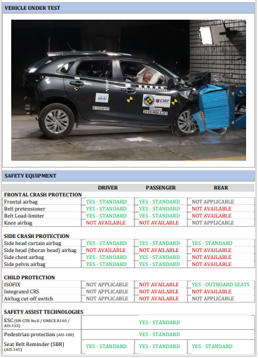 Along with the 2 airbag, the 6 airbag version of the Baleno was also tested, the vehicle was able to score a adult occupancy safety score of around 26.52/32 that led it to score about 4 starts out of 5. In the Child Occupant Protection the car was able to score 34.81 out of 49 that helped it score around 3 star protection out of 5. The 6 airbag version has Frontal airbags, side head curtain airbags , Side Chest Air bag, Side Pelvis Air bag. The Vehicle also had Isofix seats at the rear.