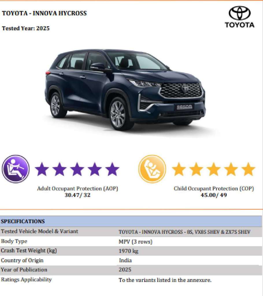 The Innova Hycross was one of the top selling Hybrid MPV in India , and has been able toe establish its portfolio in the market. With the new 5 star Bharat NCAP rating, the Hycross has now been able to establish itself as one of the safest MPV in India.