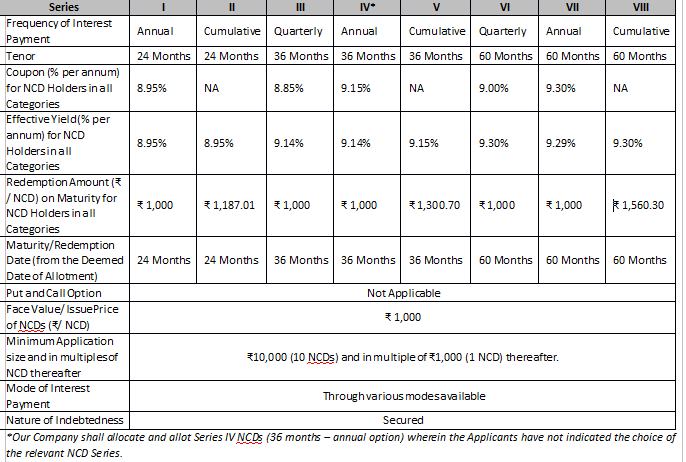 The NCDs have a face value of ₹1000 each. Each application will be for a minimum of 10 NCDs and in multiples of 1 NCD thereafter. The minimum application size would be ₹10,000.