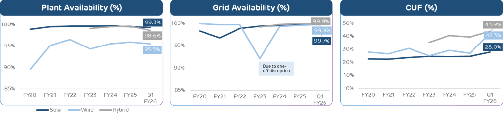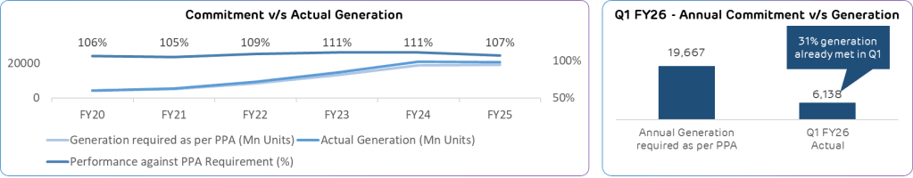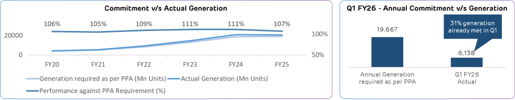 - Exceeding Commitments: AGEL has consistently generated electricity exceeding the overall annual commitment under the power purchase agreements (PPA). In Q1 FY26, AGEL’s PPA based electricity generation was 31% of the annual commitment.