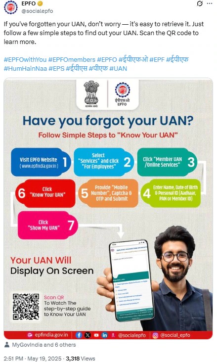 The EPFO posted on X, earlier this month- “If you’ve forgotten your UAN, don’t worry — it’s easy to retrieve it. Just follow a few simple steps to find out your UAN. Scan the QR code to learn more.”