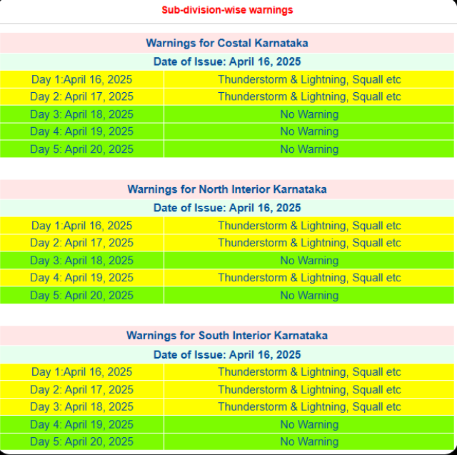 Sharing the subdivision-wise weather report for the next five days on X, Karnataka State Natural Disaster Monitoring (KSNDMC) said, “Thunderstorms, lightning, and gale force winds with gusts reaching 30-40 kmph are likely across the state for the next 5 days, with scattered moderate rainfall in the North Interior and South Interior districts.” Residents must note that there is a warning for thunderstorms, Lightning, & Squall on April 17 in Coastal Karnataka, North Interior Karnataka, and South Interior Karnataka. Thereafter, IMD has issued an alert against thunderstorms, Lightning, & Squall in North Interior Karnataka on April 19. Meanwhile, on the 18th of April, South Interior Karnataka will face similar conditions.