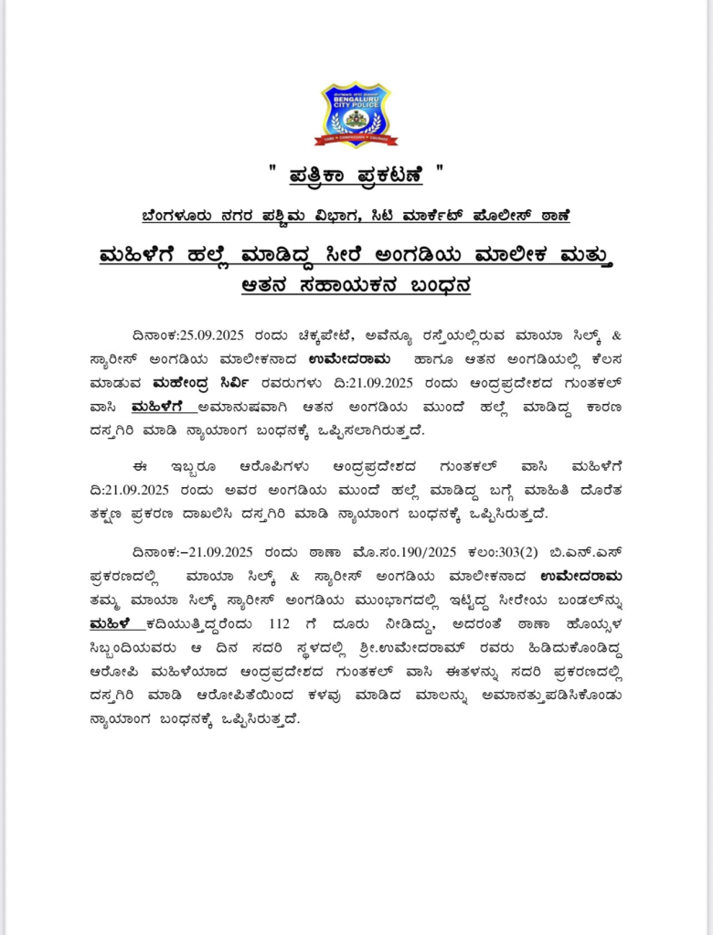 According to police, a woman named Humpamma visited a shop on Bengaluru’s Avenue Road and stole a bundle of sarees, escaping after the theft. The entire act was captured on the shop’s CCTV. Later, she returned to steal more sarees, but the shopkeeper recognized her and caught her in the act.