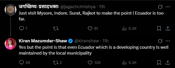 Kiran’s comments quickly spread on social media, getting many reactions. Some people agreed with her, pointing out the bad roads and garbage problems in Bengaluru. Others mentioned cities like Mysuru and Indore, which have done a good job keeping clean.