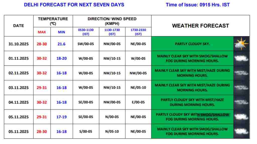 Several parts of the city saw clear clouds today, with improved visibility compared to recent days. There is no forecast for rain in the capital this week, but residents will see mostly clear skies with mist/haze prevailing over the city till November 3, 2025. Thereafter, Delhites will experience a partly cloudy sky with smog/hallow on November 5 and 6.