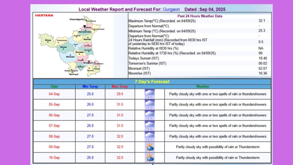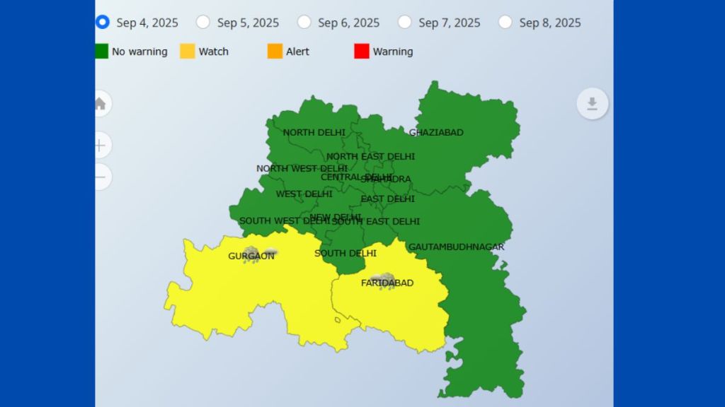 Gurugram remains under a yellow alert for moderate to heavy rainfall. The IMD’s Interactive Display of weather and Thunderstorm warnings shows both Gurugram and Faridabad currently under yellow alert. The forecast for September 5, includes partly cloudy sky with one or two spells of rain or thundershowers. The maximum temperature will remain around 31 degree Celsius.