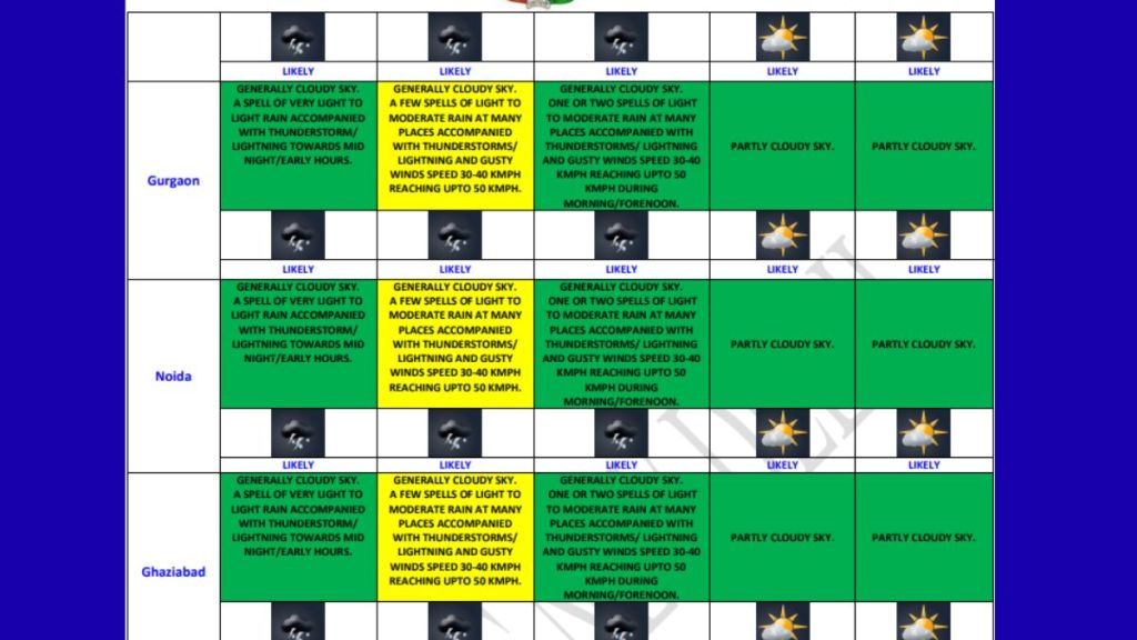 Noida- The IMD has forecast generally cloudy sky with a few spells of light to moderate rain at many places accompanied by thunderstorms/lightning and gusty winds with speed 30-40 kmph, occasionally reaching upto 50 kmph.