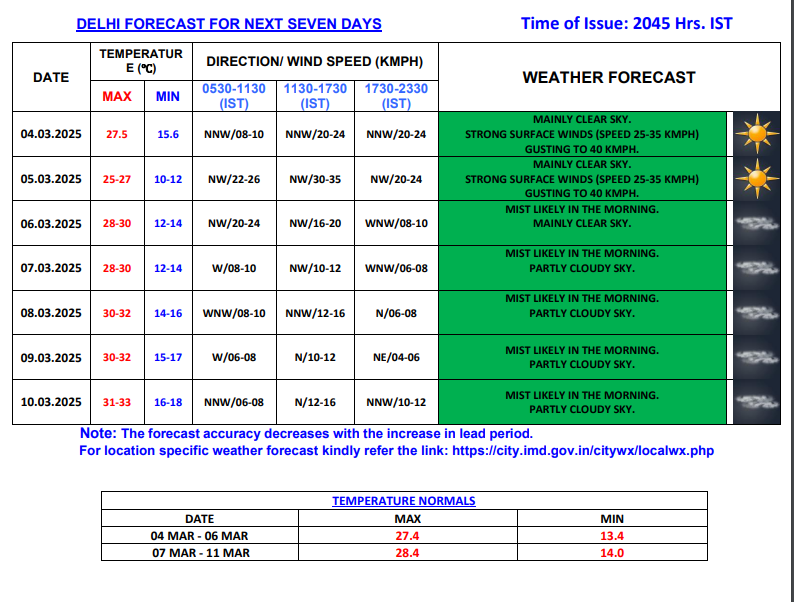 The India Meteorological Department (IMD) has predicted strong surface winds to prevail during day time on Wednesday. It has predicted mainly clear sky on 5 March. The maximum and minimum temperatures will remain 26 and 11 degrees Celsius respectively. IMD in its observation noted that there has been appreciable rise in minimum temperatures and fall in maximum temperatures over Delhi/NCR during the past 24 hours. The Maximum and Minimum temperatures are currently in the range of 26 to 28°C and 14 to 16°C respectively.