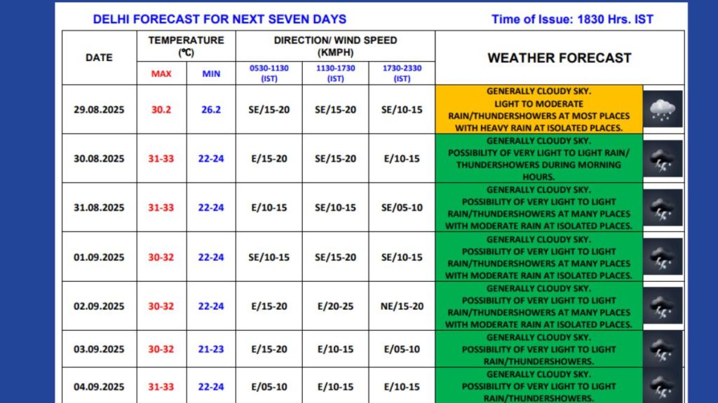 According to the IMD’s weather update issued on Friday, August 29, active monsoon conditions are expected to prevail over Delhi during next 5 days. This implies that the city is going to witness moderate to heavy rainfall in the upcoming week. The first week of September is likely to bring intense rainfall, with thundershowers predicted on most days.