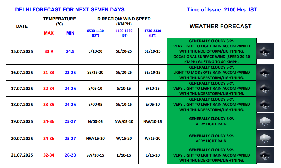 Forecasts predict that the skies in New Delhi will generally be cloudy with some periods of storms or showers up to July 21, when intermittent sunshine is expected. There will also be surface winds reaching speeds of 40 kmph that will keep the climate mostly temperate, with temperature fluctuations of 24–34 °C, before the development of localised storms or disturbances as the wind direction changes.