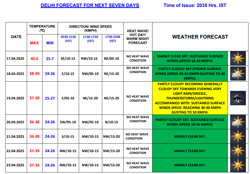 Delhi is expected to begin the day on April 17 under mainly clear skies which will start becoming partly cloudy by the evening. Heatwave conditions are predicted to prevail in isolated regions. Maximum temperatures will remain in the high range of 39°C to 40°C and minimums between 23°C to 25°C.