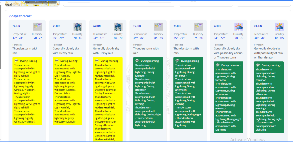 Rainy spell will continue throughout the upcoming week (June 22-29), with yellow alert issued until June 24. Here’s detailed forecast for the upcoming days.