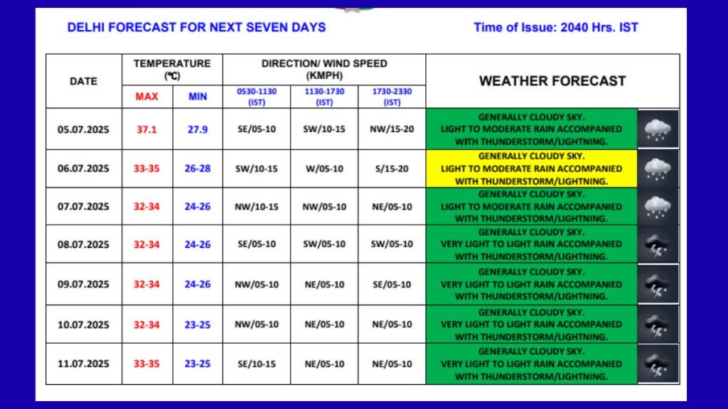 The national capital is set to remain under the influence of active monsoon conditions throughout the upcoming week, with a generally cloudy sky prevailing each day. On July 7, the residents can expect light to moderate rainfall, accompanied by thunderstorms and lightning, with daytime temperatures ranging between 32-35°C. Winds will vary in direction, with moderate south-westerly and north-westerly flows dominating. From July 8 onward, the intensity of rainfall is expected to slightly reduce.