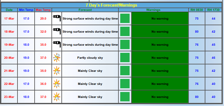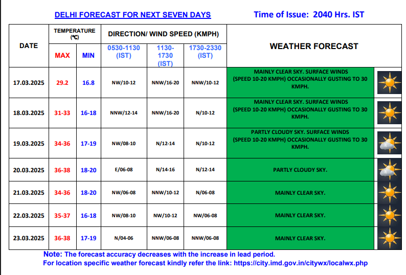 The maximum temperature is expected to remain 37 degrees Celsius on 20th March. It will remain 35 degrees Celsius on 21 and 22 March. The temperature will again climb to 37 degrees Celsius on 23rd March. Delhi will experience strong surface winds during day on 19th March as well. Partly cloudy sky has been predicted on 19th and 20th March. The data indicates that warmer days are ahead for Delhi, with temperatures expected to rise significantly this week. For more update refer the below mentioned table.