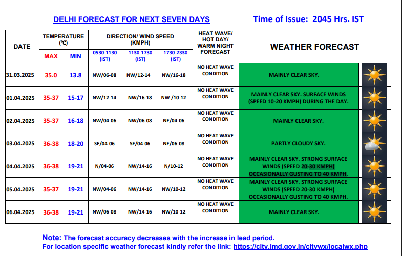 On Tuesday, April 1, the maximum temperature is expected to remain 35 degrees Celsius. The sky will remain mainly clear with maximum humidity level of 42 percent. Strong surface winds with speed of 10-20 km/h will prevail during the day. The IMD in its bulletin, stated that the Maximum and minimum temperatures are in the range of 33 to 37°C and 13 to 15°C respectively. The minimum temperatures are appreciably below normal by 3-4°C, whereas maximum temperatures are near normal over most places over Delhi.