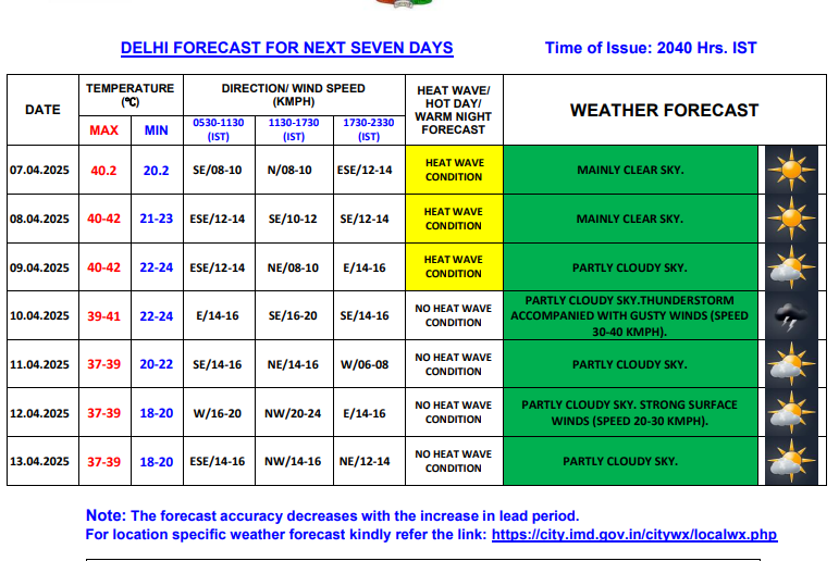 The sky will remain clear until April 9 and will turn partly cloudy from April 10 and remain so until April 13. Residents are expected to see little relief on April 10, as thunderstorm and gusty winds with high speed have been forecasted for Thursday. Strong surface winds have been predicted for April 12 also. No heatwave conditions is likely after April 10 this week.