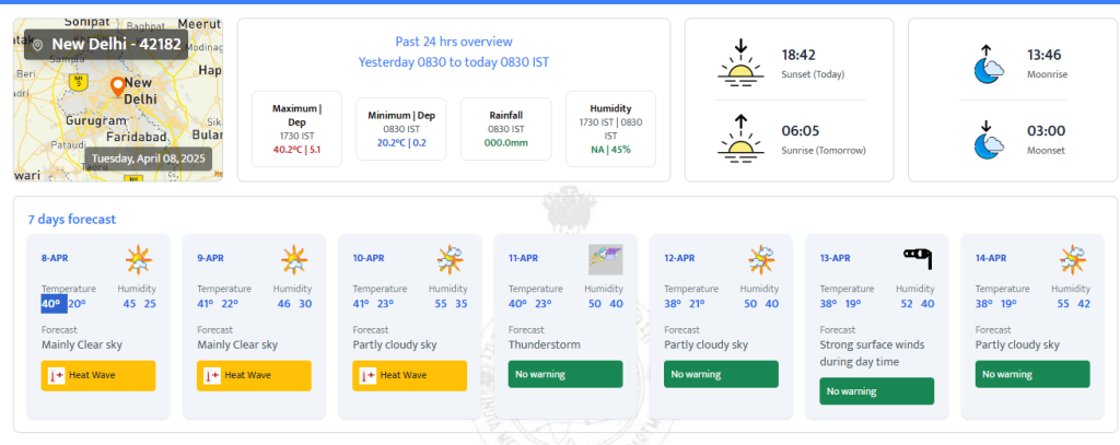 Talking about how the weather will be today in Delhi, the IMD forecast tells us of scorching heat. The maximum temperature is expected to reach 40 degrees Celsius. A maximum humidity level of 45 per cent has been predicted in the national capital. The sky will remain mainly clear. Residents will continue to face challenges, as yellow alert for heatwave has been issued for Tuesday, April 8. According to the IMD, the Maximum and Minimum temperature is currently in the range of 39 to 41°C in Delhi.
