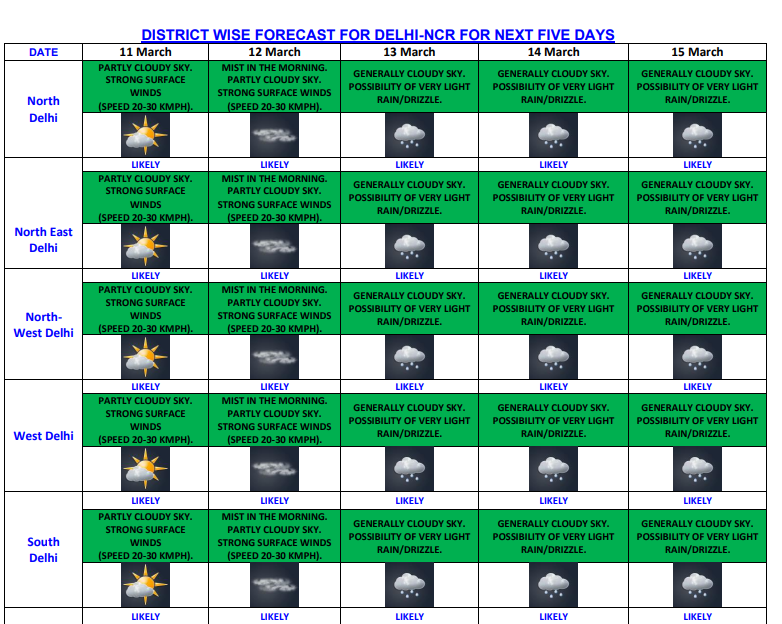 While the temperature is rising, Delhi’s weather will witness some changes this week. The IMD has predicted light rain to lash capital from 13 to 15 March. Sky will remain generally cloudy on these days. The maximum temperature is expected to reach 34 degrees Celsius on 13 and 14 March. Mist will engulf parts of Delhi on 16 and 17 March.