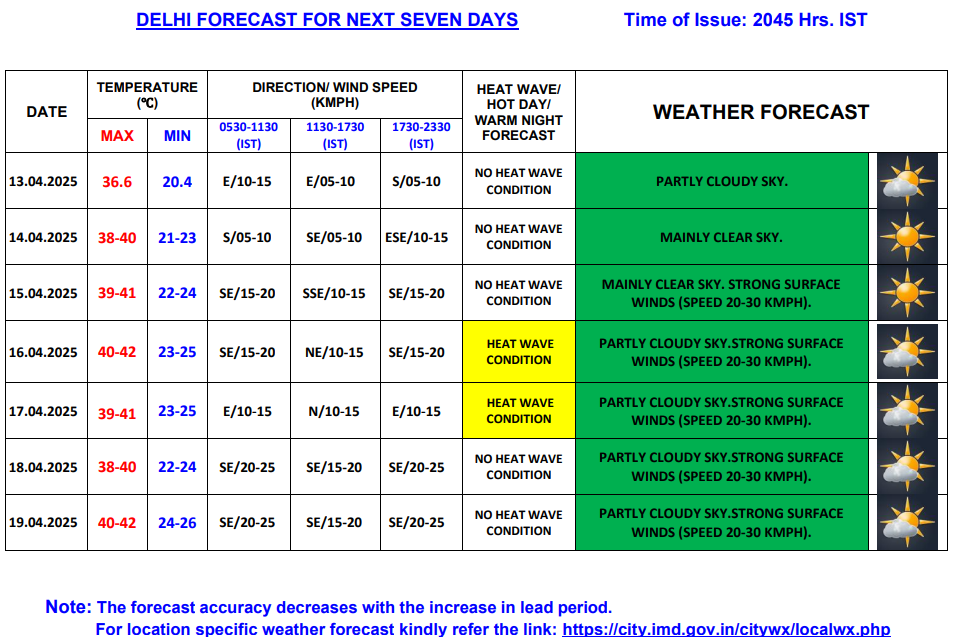 Delhi-NCR is set to experience mainly clear skies over the next couple of days, with temperatures gradually rising. According to the IMD, April 14 and 15 will remain largely clear, with maximum temperatures hovering between 38°C to 41°C and minimums around 21°C to 24°C. However, from April 16 onward, the region is likely to see a spike in heat, with partly cloudy skies and heatwave conditions expected in isolated areas. Maximum temperatures are forecasted to touch 40°C to 42°C, indicating the onset of more intense summer heat.