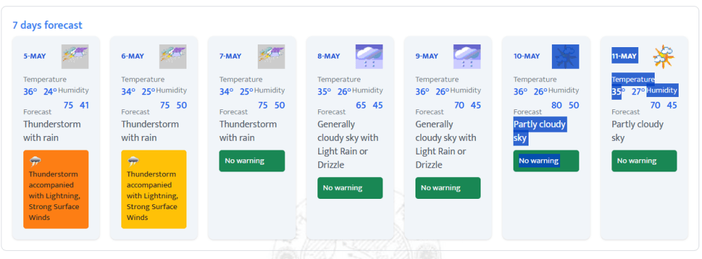 This week will begin with rain, which is expected to continue in the coming days. The maximum and minimum temperatures are in currently in the range of 34 to 36°C and 23 to 24°C respectively. Rain with thunderstorm will lash the capital until May 7. Light rain or drizzle is expected between May 8 and May 9. Surface winds are likely to prevail on all days until May 8. Furthermore, cloudy sky will persist in the national until May 10. A yellow alert for thunderstorm accompanied with lightning, strong surface winds has been issued for Tuesday, May 6. The IMD has forecast no heatwave condition this week, offering relief for extended period.
