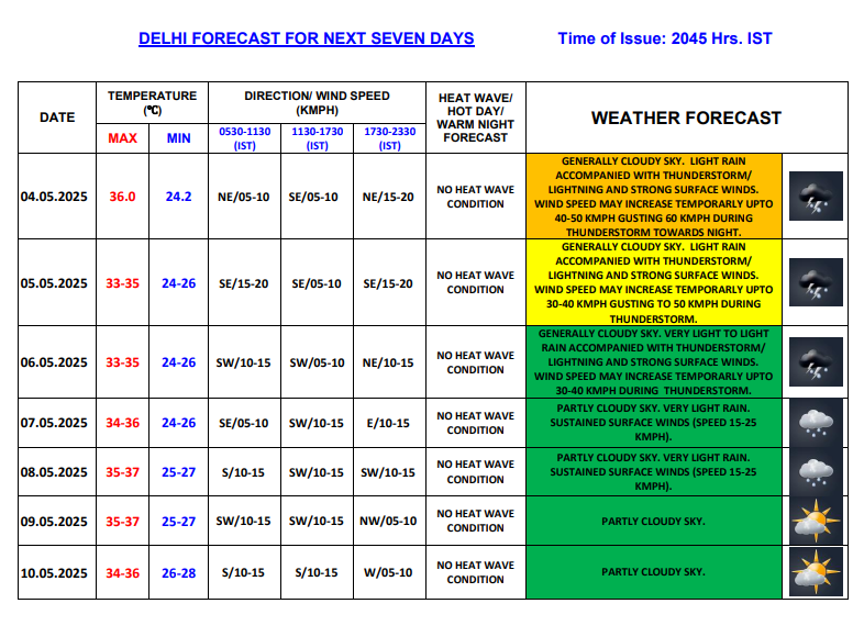 Talking about how the weather will remain on Monday, May 5, the IMD forecast indicates of a rainy day. An orange alert for thunderstorm accompanied with lightning, strong surface winds has been issued by the IMD. Generally cloudy sky, light rain accompanied with thunderstorm/ lightning and strong surface winds with speed increasing temporarily up to 30-40 kmph gusting to 50 kmph during thunderstorm towards night are expected in Delhi today. The IMD has ruled out any heatwave conditions as the maximum temperature is expected to remain 36 degrees Celsius on Monday. A humidity level of 24 per cent is likely in the national capital.
