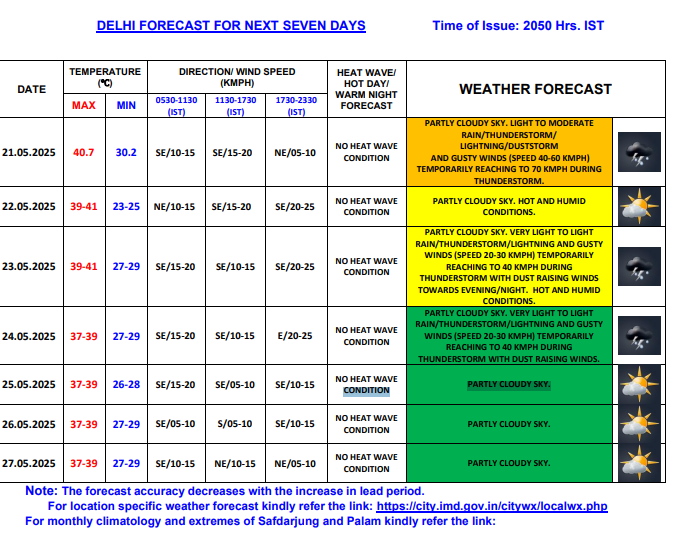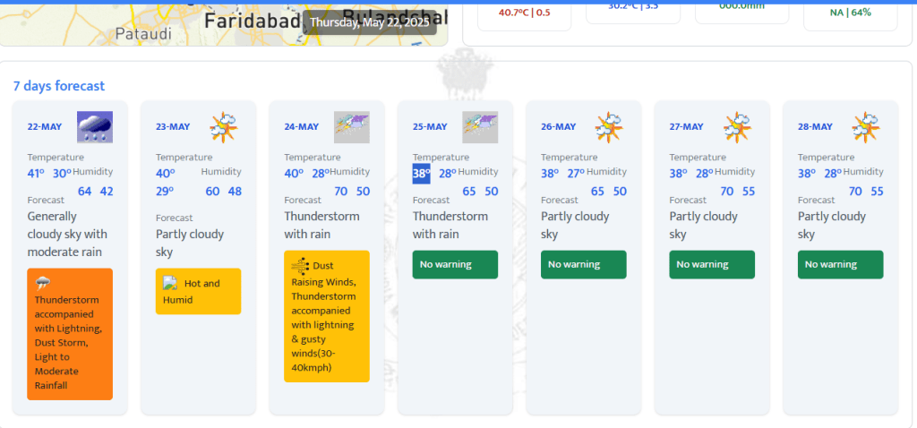 May 23: Partly cloudy sky with very light to light rain/thunderstorm/lightning and gusty winds (speed 20-30 kmph) temporarily reaching to 40 kmph during thunderstorm with dust raising winds towards evening/night. Hot and humid conditions will prevail. The maximum temperature is expected to remain 40°C.