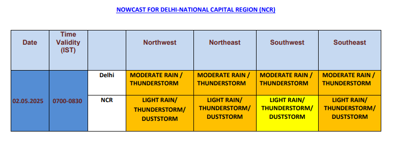 “02/05/2025: 05:15 IST; Moderate to intense spells of rainfall accompanied with moderate to severe thunderstorm and lightning (40-90 Km/h gusty winds) is very likely to continue at many places of Delhi and NCR, Yamunanagar, Karnal, Safidon, Panipat, Sohana, Palwal, Nuh, Aurangabad, Hodal (Haryana) Gangoh, Shamli, Kandhla, Nandgaon, Barsana, Raya, Hathras, Mathura, Sadabad, Agra, Jajau (U.P.) Bhiwari, Deeg, Bharatpur (Rajasthan) during next 2 hours. @moesgoi @ndmaindia @airnewsalerts @DDNewslive,” wrote IMD on X.