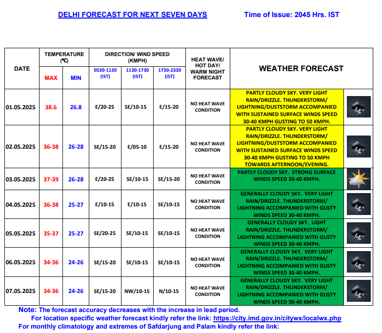 According to the IMD forecast, thunderstorm and rain have been predicted on May 3, 5 and 6. Cloudy sky has been forecast until May 7 with possibility of light rain/ drizzle. Gusty winds will prevail over Delhi on remainder days of the week. The maximum temperature is expected to remain in the range of 37-39 degrees Celsius. No heatwave condition has been predicted by the IMD. The forecast, therefore indicates a brief period of relief from the heat, with pleasant weather conditions in the national capital.