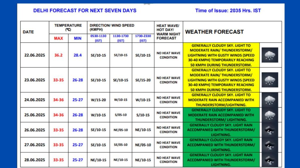As monsoon nears Delhi, rainy spell will continue throughout the upcoming week (June 22-29), with yellow alert issued until June 24. Here’s detailed forecast for the upcoming days.