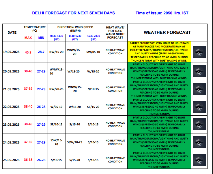 May 23: Very light to light rain/thunderstorm/lightning and gusty winds (speed 30-40 kmph) temporarily reaching to 50 kmph during thunderstorm. The maximum temperature will remain 39°C.