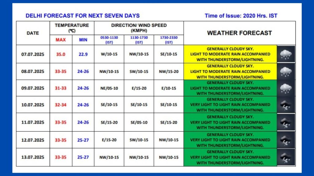 According to the IMD, Delhi will witness intermittent rain, dense cloud cover, and occasional thunderstorms over the next few days. The sky is expected to remain generally cloudy throughout the week. Residents can expect light to moderate rainfall, accompanied by thunderstorms and lightning, with daytime temperatures ranging between 32°C and 35°C until July 12. This rainfall is part of the monsoon system currently active over northern India, bringing moisture-laden winds and intermittent showers across the region.