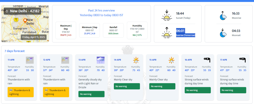 The weather is going to remain pleasant on Friday, April 11 as well. Very light rain/drizzle accompanied with Thunderstorm/lightning and strong surface winds speed reaching 30-40 km/h gusting to 50 km/h has been predicted for Delhi. A yellow alert for thunderstorm has been issued by the India Meteorological Department (IMD) for today. The maximum temperature is expected to remain 40°C with relative humidity level of 55 per cent. According to the IMD, under the influence of Western Disturbance, heat wave conditions are likely to abate from Delhi on April 11.