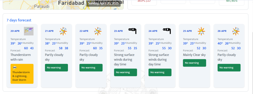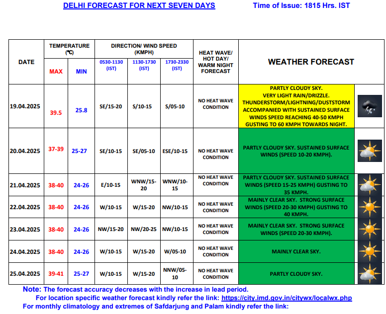 IMD’s 7 day forecast for Delhi, indicates hot day with maximum temperature in the range of 38-39 degrees Celsius. The sky conditions will remain partly cloudy until April 22 and turn clear after that. Strong surface winds during the day time have been forecast on April 23 and 24. The maximum temperature is expected to reach 40 Degrees Celsius on April 26. No heatwave condition has been forecast until April 26 in the national capital.
