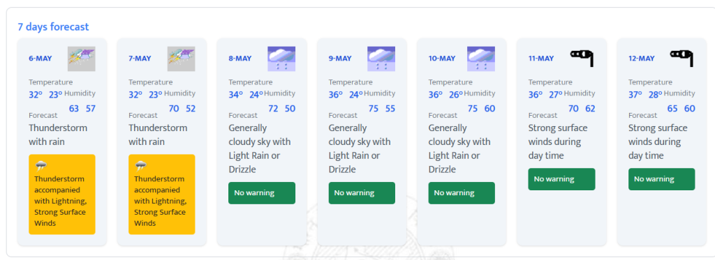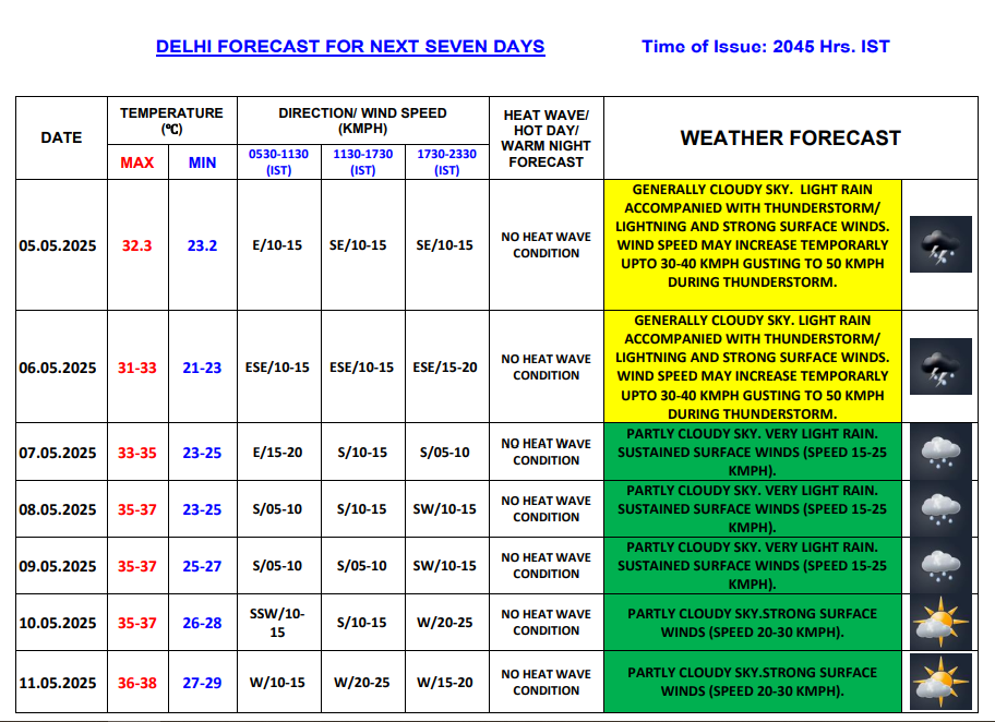 The rainy spell is expected to continue in the coming days. A yellow alert has been issued for rain, thunderstorm accompanied with lightning, strong surface winds on Wednesday, May 7. Light rain or drizzle is expected until May 10. Surface winds are likely to prevail on all days until May 11. Furthermore, cloudy sky will persist in the national until May 11. The IMD has ruled out any heatwave conditions this week as the maximum temperature is expected to remain in the range of 34-36 degrees Celsius. This indicates a relief for extended period from the heat.