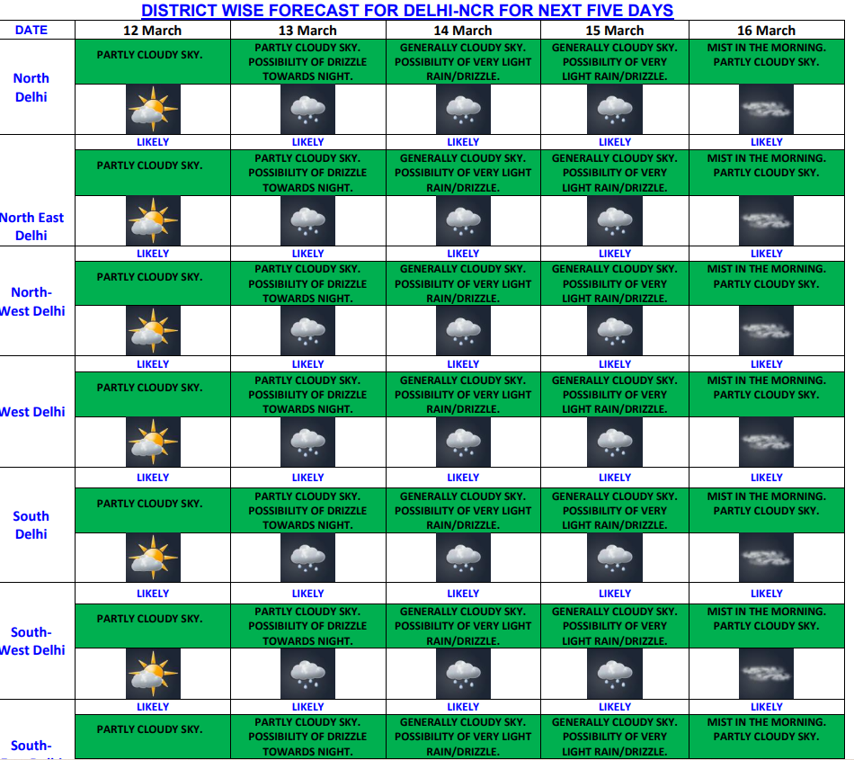 On the 14th and 15th of March, IMD predicts generally cloudy skies with the possibility of very light rain and drizzle across the city. Thereafter, on the 16th of March, the skies will remain partly cloudy with mist during the morning hours. Residents will witness a clear sky next Monday and Tuesday, with misty conditions on the morning of 17th March.