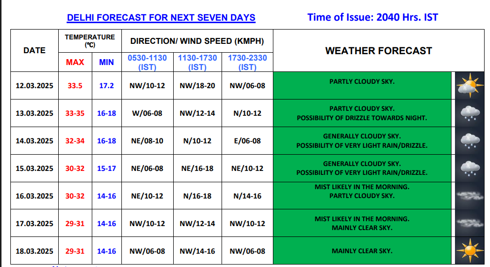 Delhi Weather Update: The national capital has experienced a notable shift in temperature as warmer days have arrived. The India Meteorological Department (IMD) observed a slight rise in minimum temperatures and a slight decline in maximum temperatures in Delhi/NCR during the past 24 hours. The Met Body predicts a partly cloudy sky with a possibility of drizzle towards the night tonight. Westerly winds blew at a speed of less than 10 Kmph yesterday, March 12, 2025.