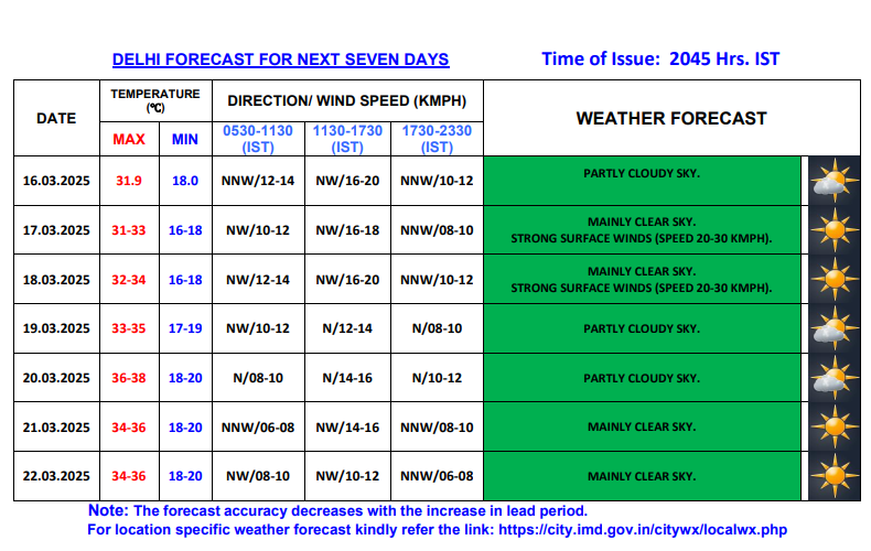 The maximum temperature is expected to remain 37 degrees Celsius on 20th March. It will remain 35 degrees Celsius on 21 and 22 March. Delhi will experience strong surface winds during day on 18th March. Partly cloudy sky has been predicted on 19th and 20th March. The data indicates that warmer days are ahead for Delhi, with temperatures expected to rise significantly this week. For more update refer the below mentioned table.