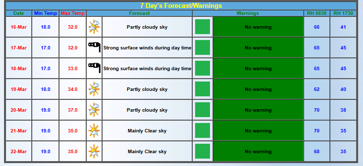 The India Meteorological Department (IMD) has predicted strong surface winds (speed 20-30 kmph) to prevail over Delhi during the day on Monday, 17th March. Sky will remain mainly clear. The maximum and minimum temperatures will remain 32 and 17 degrees Celsius respectively. No other specific warning has been issued by the IMD.