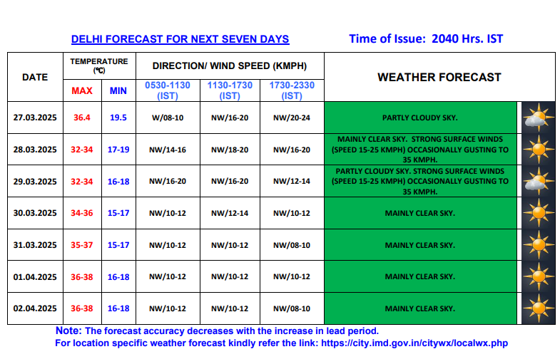 Talking about how the weather will be in coming days, the IMD forecast tells us of rising temperatures and hot conditions. March is expected to end with maximum temperature of 35 degrees Celsius. Whereas April will begin with a maximum temperature of 37 degrees Celsius. It is further expected to remain 33 degrees Celsius on 29th March. A temperature of 35°C is forecasted for 30th March. Along with the rising temperatures, strong surface winds prevail over the national capital from until 29th March with speed of 15-20 km/h. Clear sky conditions have been predicted until 31st March, except for March 29, when it will remain partly cloudy.