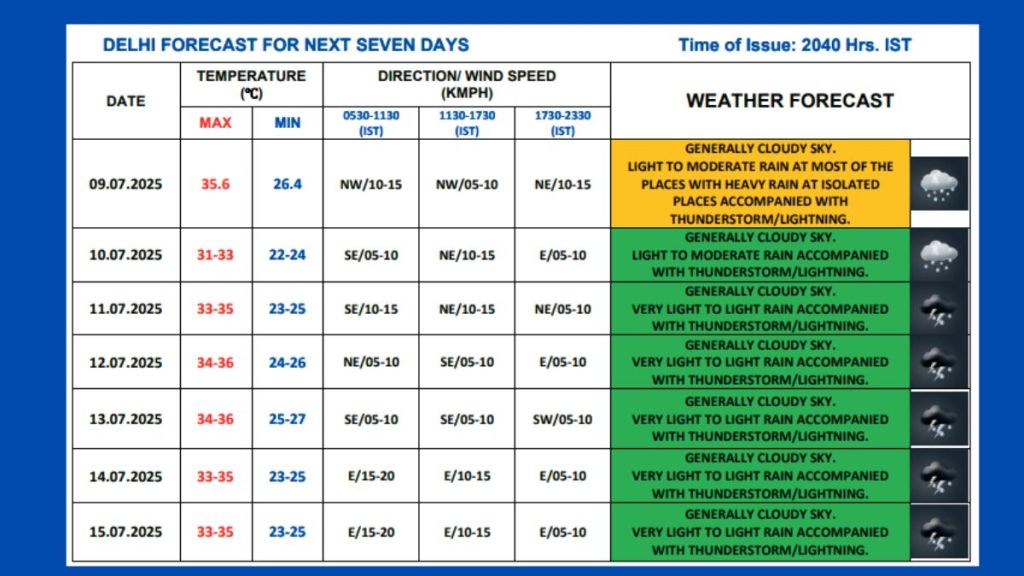 Delhi’s weather is expected to remain pleasant on Thursday, July 10. The IMD has predicted a generally cloudy sky, with light to moderate rain expected in various parts of the city. Thunderstorms and lightning are also likely in isolated areas, especially during the late afternoon and evening hours.