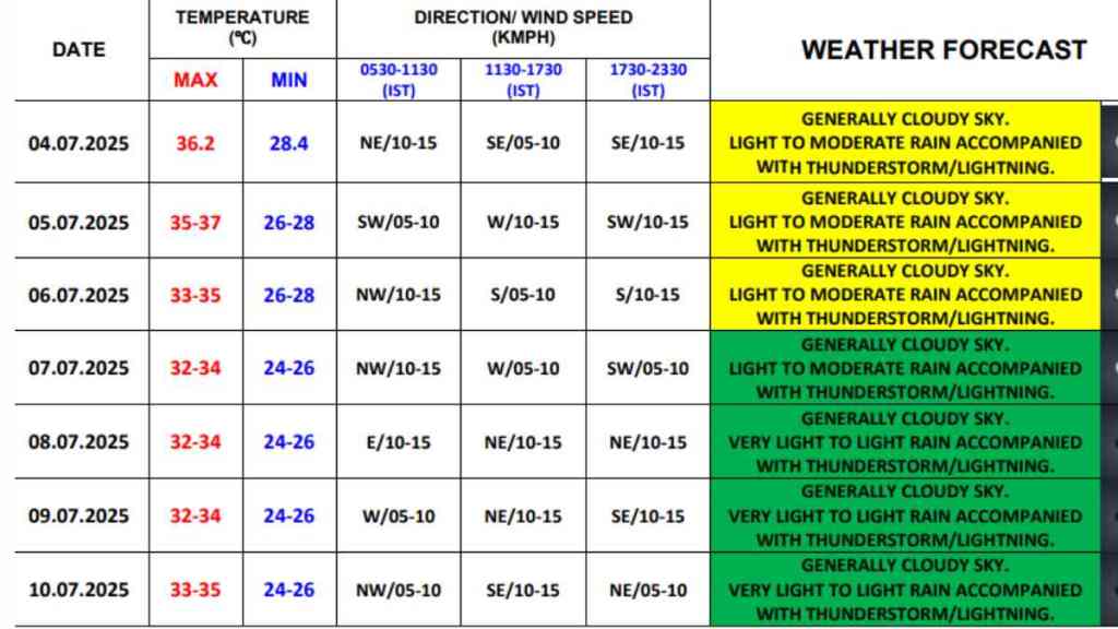 Residents might wake up to a cloudy sky on the 7th of July, as light rain is expected to lash the city, bringing much-needed respite. IMD has predicted similar conditions accompanied by thunderstorms and lightning on the 8th, 9th, and 10th. However, there might be occasional heavy rains in some parts.