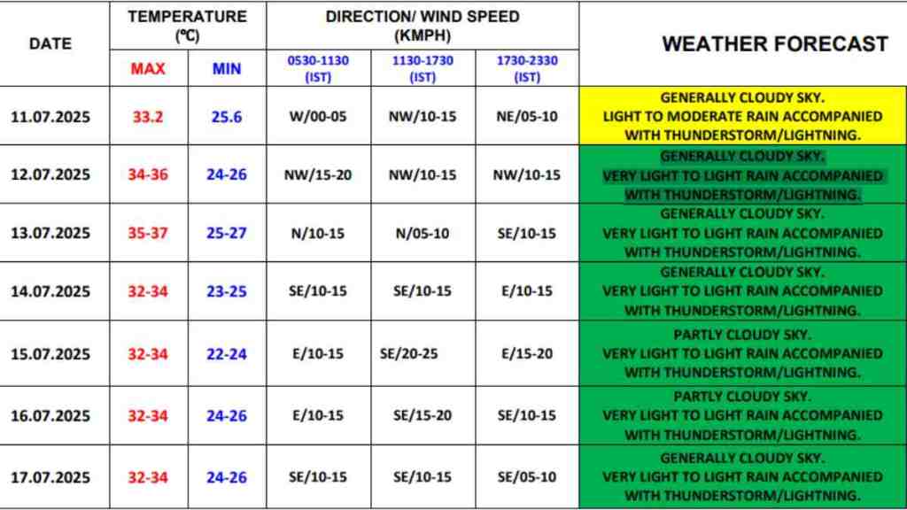 As the monsoon arrives in full swing, the weather department has predicted a generally cloudy sky over Delhi. Intermittent very light to light rain, accompanied by thunderstorms and lightning, is expected to lash the city from July 12 to 17. Temperatures are also likely to remain below 35 degrees Celsius, providing a refreshing break from humidity.