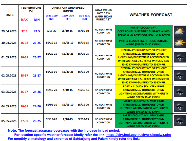 The weather forecast for coming days shows rainfall and maximum temperature in the range of 36-38 degrees Celsius. Generally cloudy sky, very light rain/drizzle, thunderstorm/Lightning/duststorm accompanied with sustained surface winds speed 30-40 kmph gusting to 50 kmph have been forecasted on May 1, 2 and 3. Furthermore, thundershowers/ rain with gusty winds are expected on May 4 and 5. The IMD forecast, therefore indicates a brief period of relief for the residents, with no heatwave condition and fall in maximum temperature.