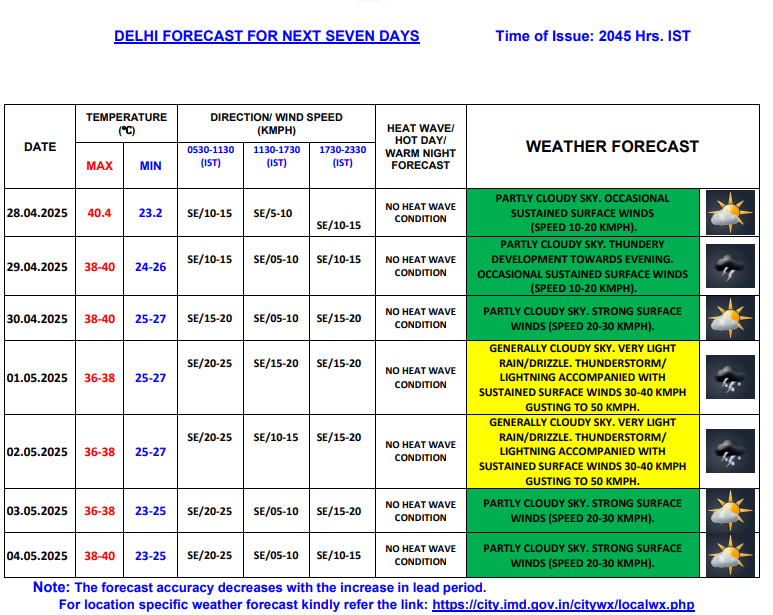 Partly cloudy sky condition will remain until May 5, while strong surface winds have been forecast on all the days of the week. There is little relief for residents, as IMD has ruled out heatwave condition this week and issued no alert for it.