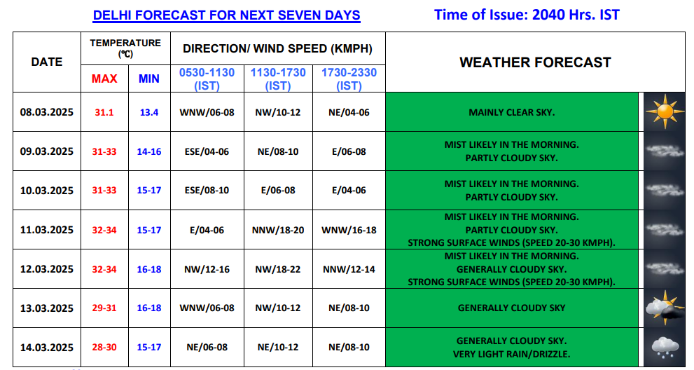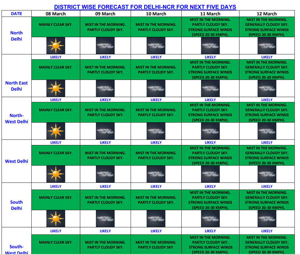 Amid the warm conditions, strong surface winds traveling at a speed of 20-30 kmph are likely to prevail over the Indo Gangetic Plains, including Delhi, on 11th & 12th March. Light rain/drizzle is expected in the national capital on the 14th of March, the IMD said.