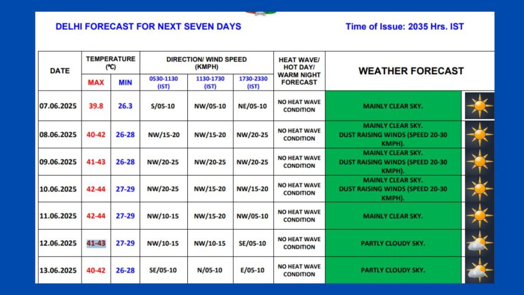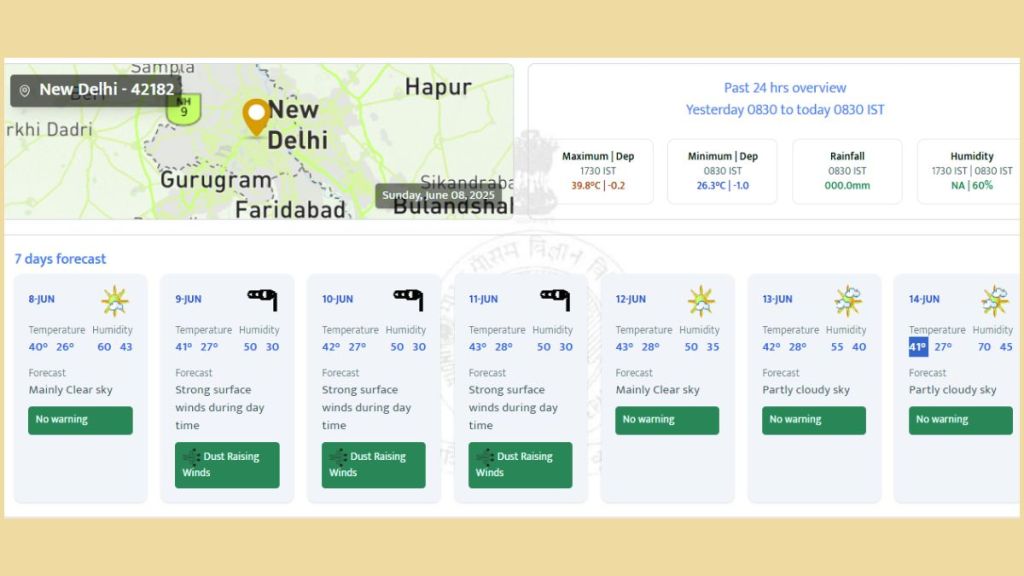 The IMD forecast for Sunday, June 8, predicts a warm day with a clear sky and a maximum temperature in the range of 40-42 degrees Celsius. Dust raising winds with speed 20-30 kmph are likely to prevail over Delhi. The maximum humidity level is expected to be around 60 per cent. While the temperature has risen significantly, the IMD has ruled out any heatwave conditions for the day.
