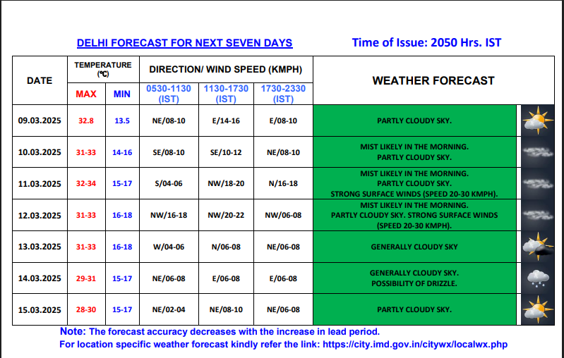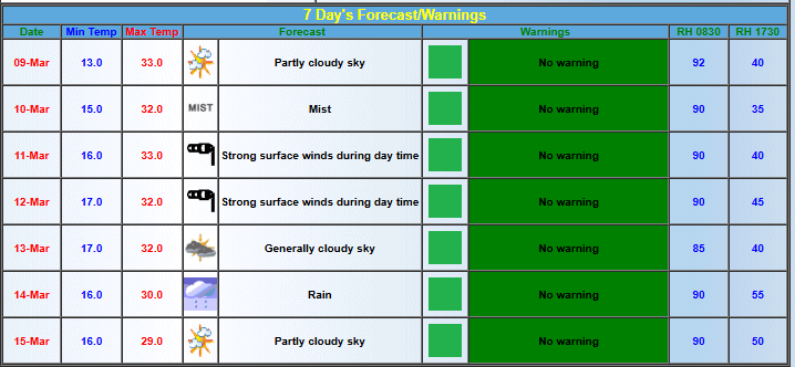 The maximum temperature is expected to reach up to 33 degrees Celsius this week. Strong surface winds as an effect of Western Disturbance will prevail on 11 and 12 March. The sky will remain generally cloudy on 13 March and partly cloudy on 15 March.