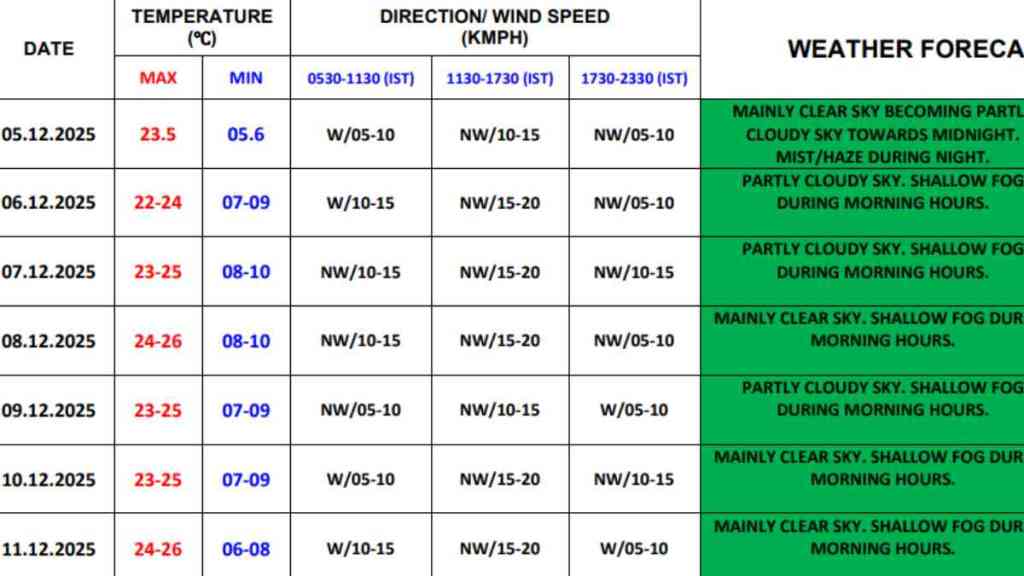 Mainly clear sky along with shallow fog is expected over the capital on December 8. Thereafter, on the 9th, skies will mostly remain partly cloudy. Thereafter, shallow fog will continue to blanket the city until December 11.