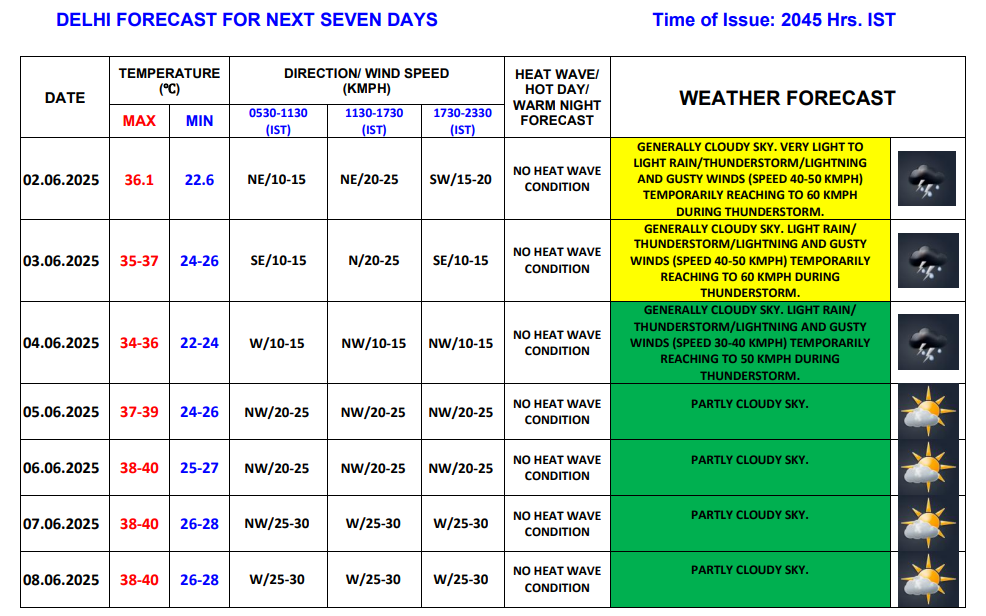 Those planning a trip to Delhi/NCR must make their travel plans accordingly, as IMD has predicted cloudy weather ahead. On 4th June, there is also a possibility of light rain, thunderstorms, lightning, and strong winds in the city. During these hours, the maximum temperatures are expected to stay between 34 to 36 degrees Celsius. Thereafter, from 5th to 8th June, Delhiites might witness partly cloudy skies, with the temperature touching the 40-degree mark. However, no heat wave conditions have been forecasted in the national capital.